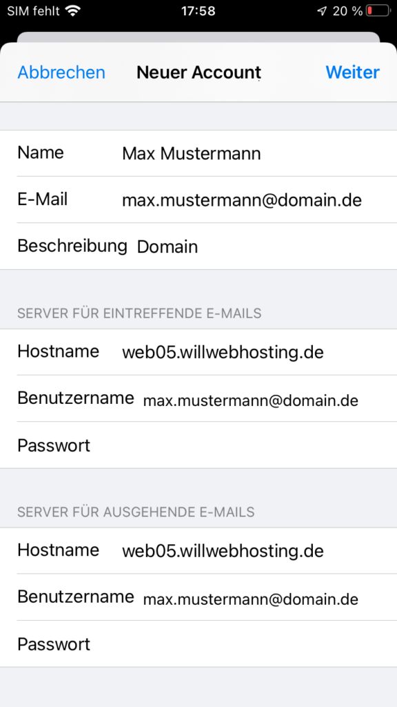 Server für ausgehende E-Mails => web05.willwebhosting.de